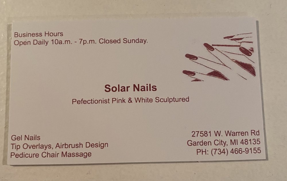 Solar Nails is located in Garden City, Michigan and serves local residents and visitors seeking reliable Nail Salon services.